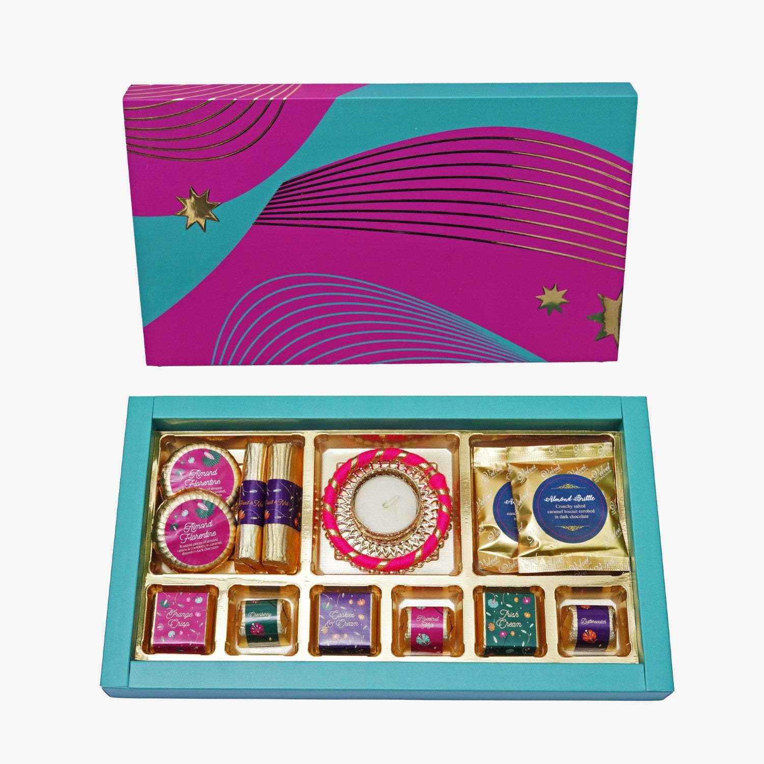 A charming assortment of gourmet chocolates and delectable sweets, all artfully arranged in a stylish gift box.