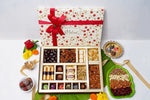 50 chocolate coated almond, 50 gms sweet and spicy trial mix, 3 assorted chocolates, 4 chocolate almond rocks, 3 fruit and nut chocolate logs, 2 energy ladoos(orange), 2 almond chocolate florentines, 2 almond brittles, 6 chocolate modaks (Pista crisp, gulkand, cranberry, lemon soft filled, roasted almond, orange crisp), 80 gms almond cranberry granola