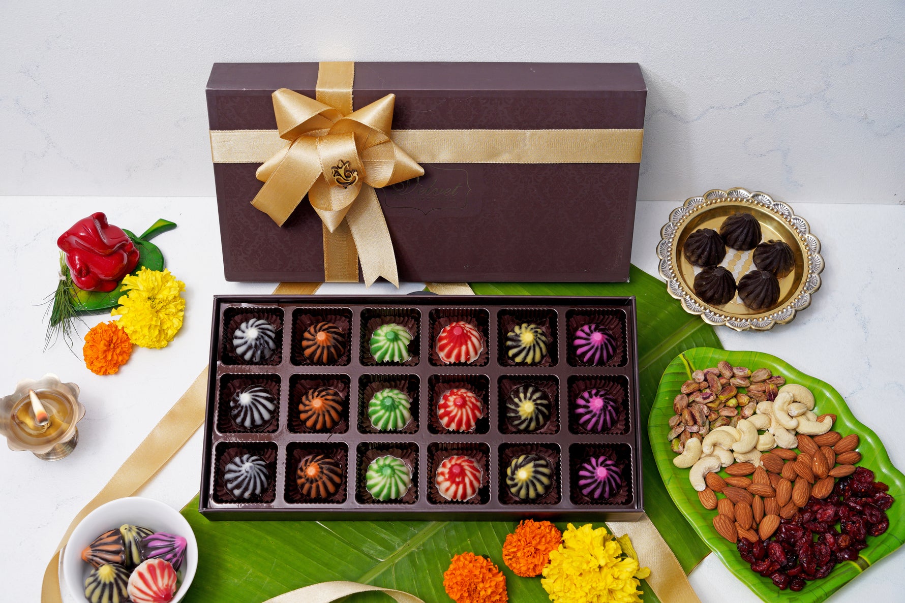 18 chocolate modaks (roasted almond, orange crisp, pista crisp, cranberry, lemon soft soft filled, gulkand)