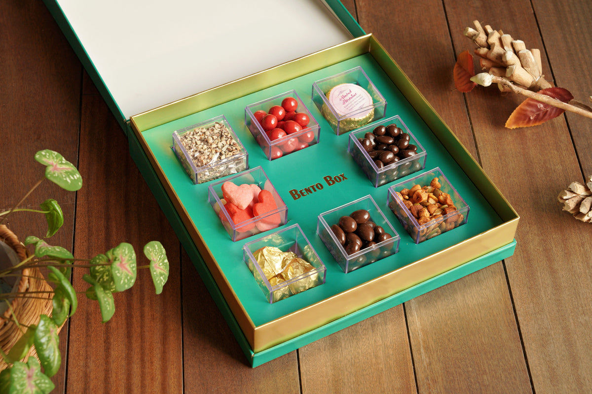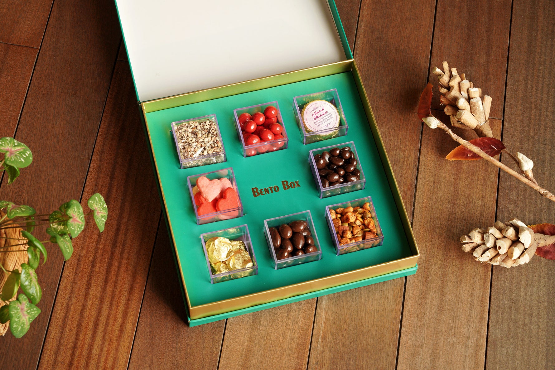 almond brittle (4 pcs), florentine (3 pcs), heart shape cookies (35 gms), Almond dragees (60 gms), cranberry dragees (60 gms), almond rocks (4 pcs), raisins dragees(60 gms), piri piri trail mix (50 gms)