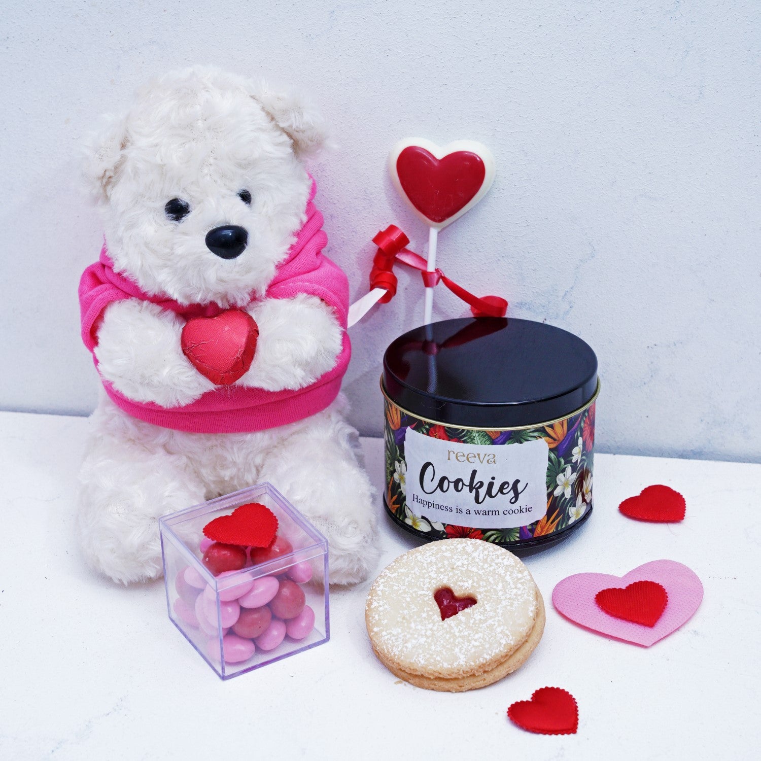 Our Beauteous and cute combo consists of a jammy dodger cookie with a sweetheart, yummy dragees, and a cute Teddy for someone special!