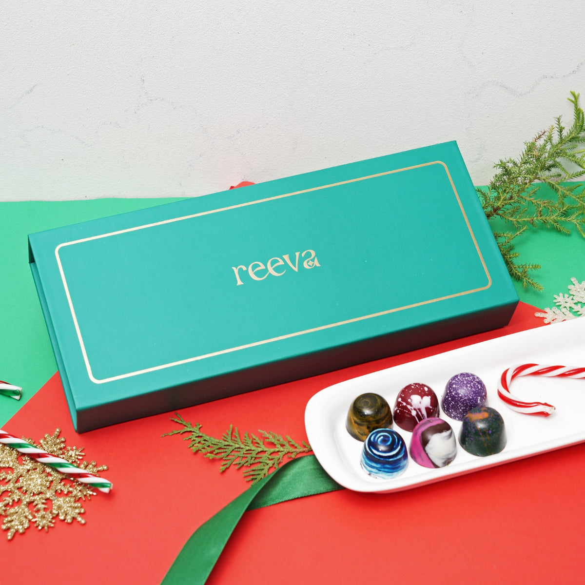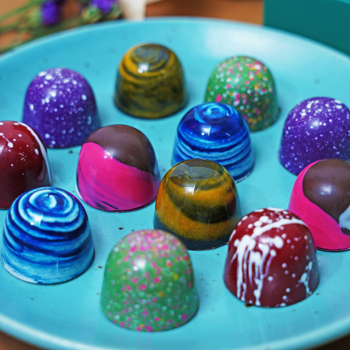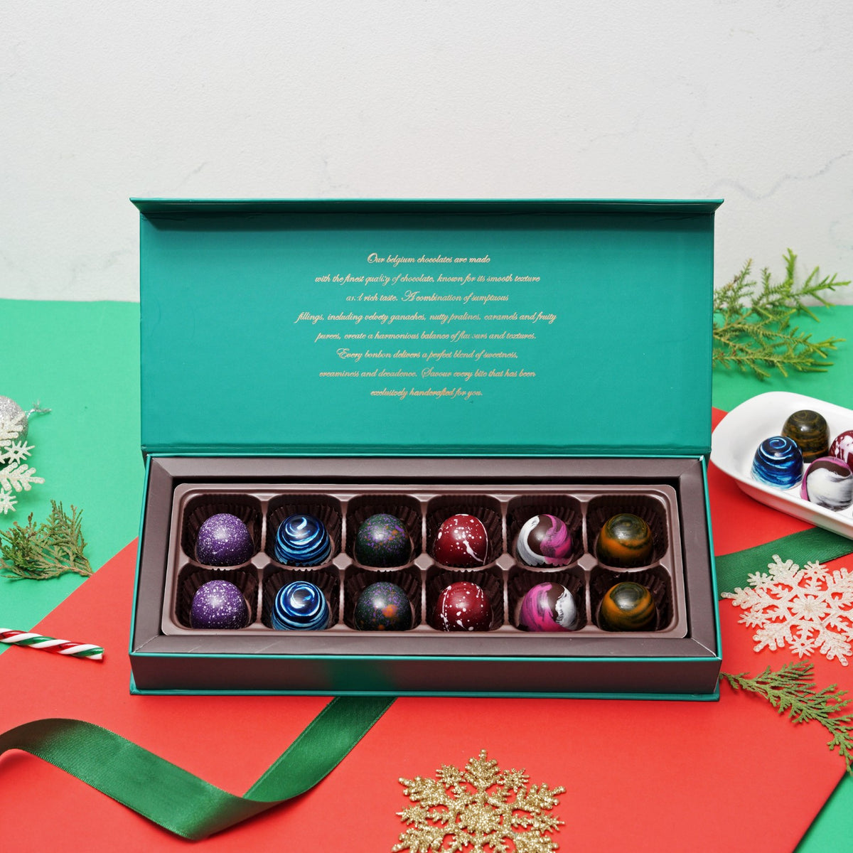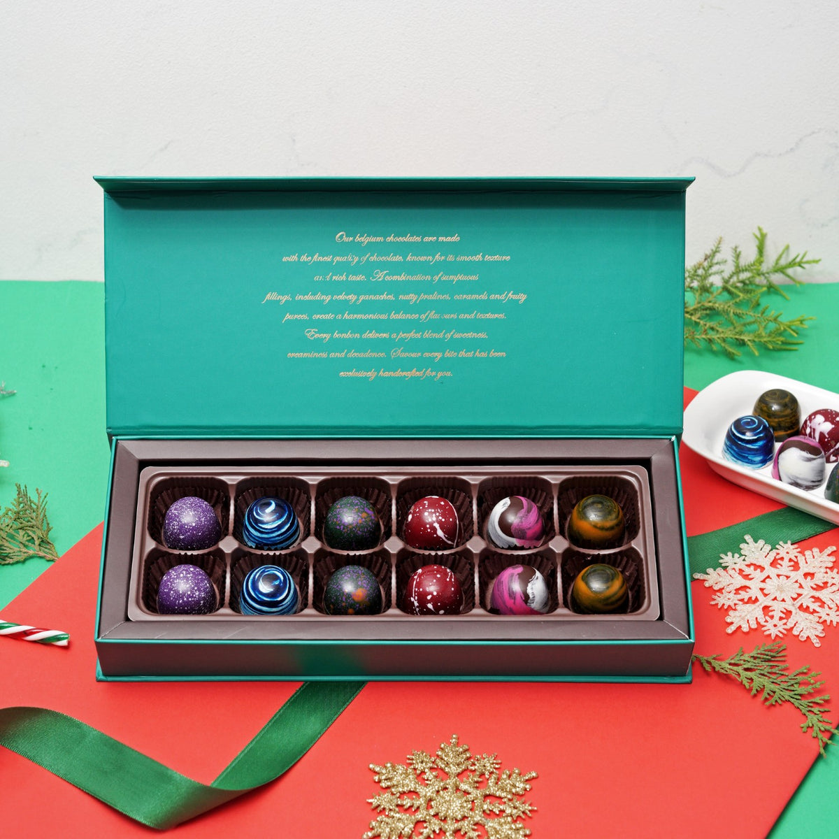 Unveil the elegance of Christmas with our Luxe Jewel Box of bon bon Chocolates. Encased in a sumptuous box, each chocolate is a gem-like creation, radiating with lustrous colors and intricate detailing. This box contains Hazelnut, salted caramel ganache, plum, palet d'or, expresso, orange.