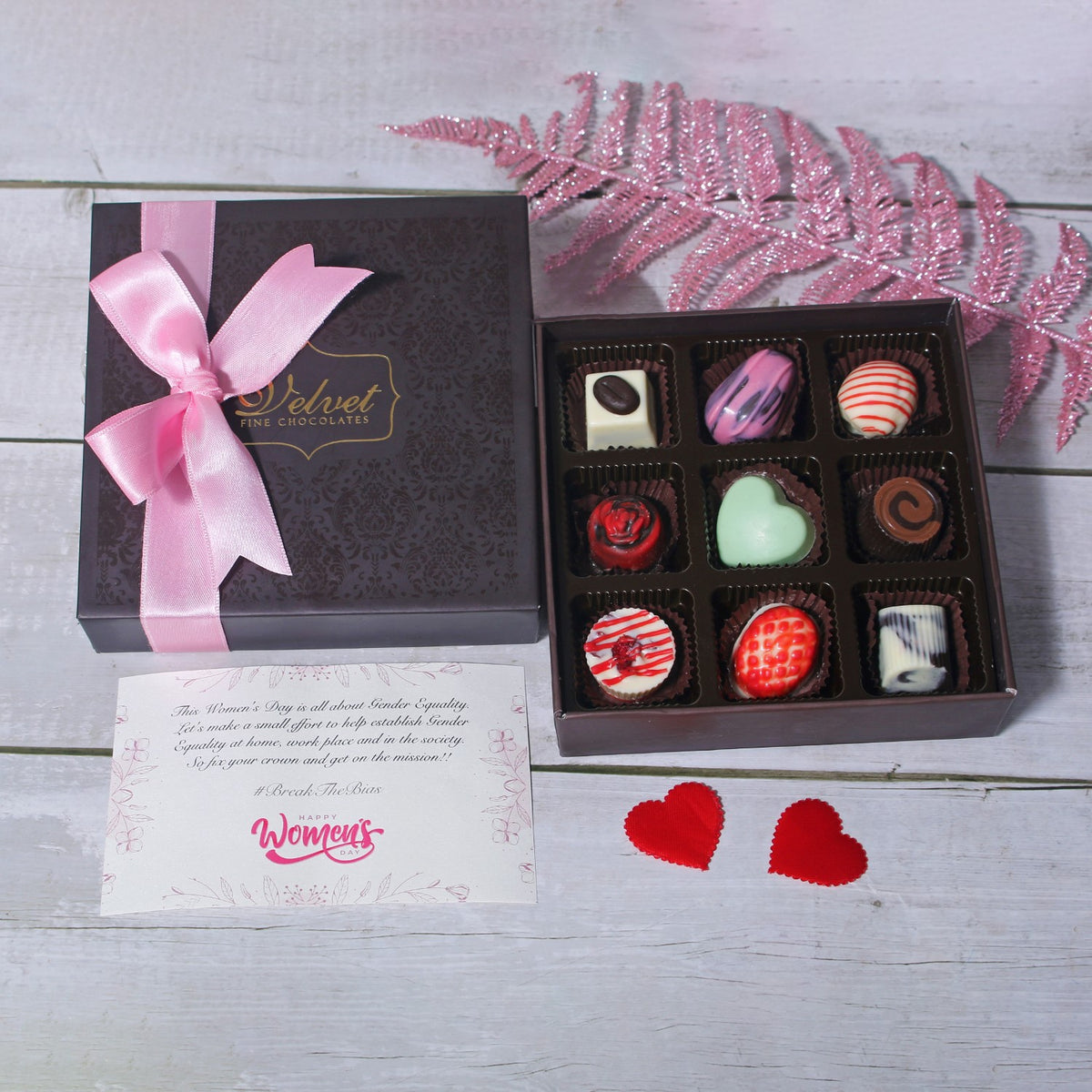 9 assorted chocolates (coffee filling, strawberry filling, rose filling, hazelnut, cranberry, butterscotch, etc)