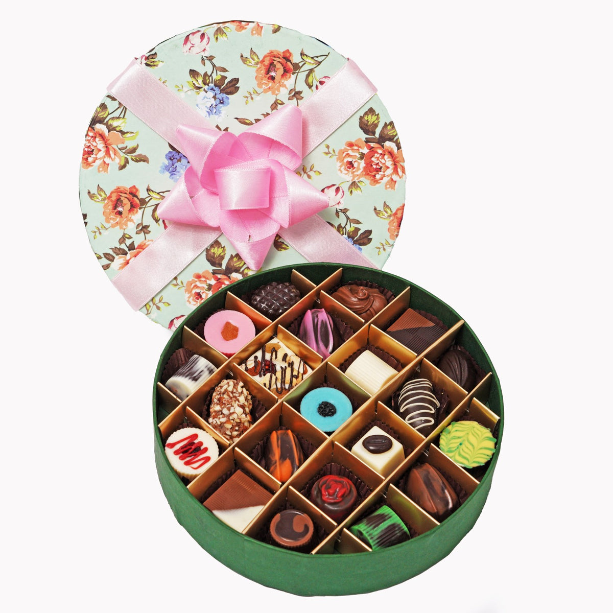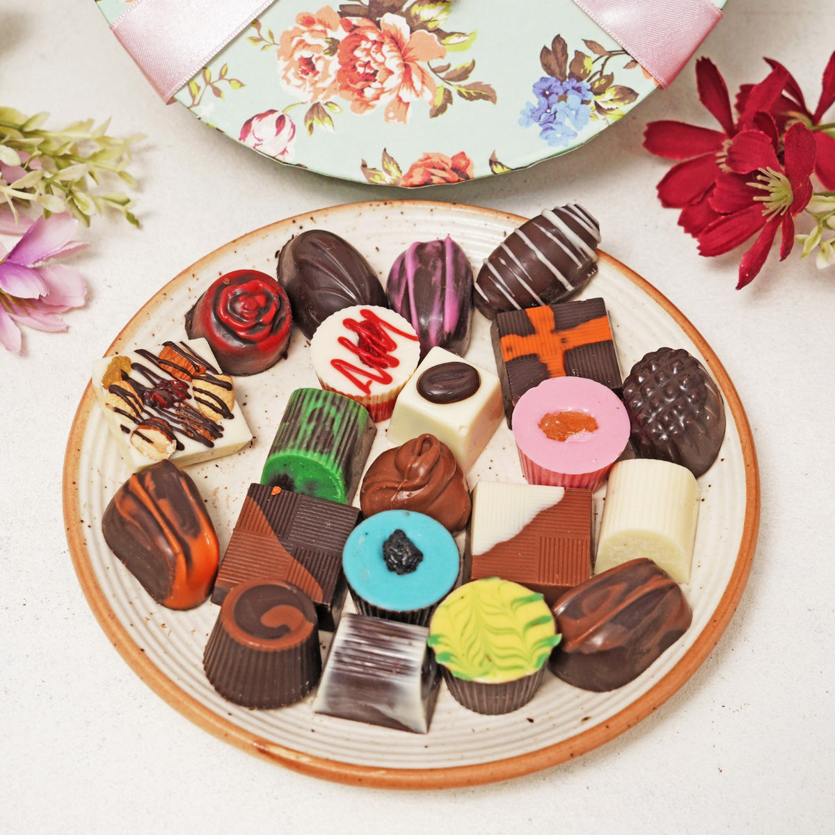 - 21 assorted chocolates [almond rock(12 gms), Plain dark and milk(13 gms), rosted almond(12 gms), fruit and nut(13 gms), strawberry soft filled(14 gms), oreo(12 gms), almond date chocolate(12 gms), lemon(14 gms), pistachio(14 gms), white mix nuts(16 gms), blueberry(14 gms), coffee soft filled(13 gms), butterscotch soft filled(14 gms), butterscotch(13 gms), orange soft filled(14 gms), rose soft filled (13 gms), mint(13 gms), cranberry(14 gms), plain white and milk(13 gms), hazelnut(14 gms)]