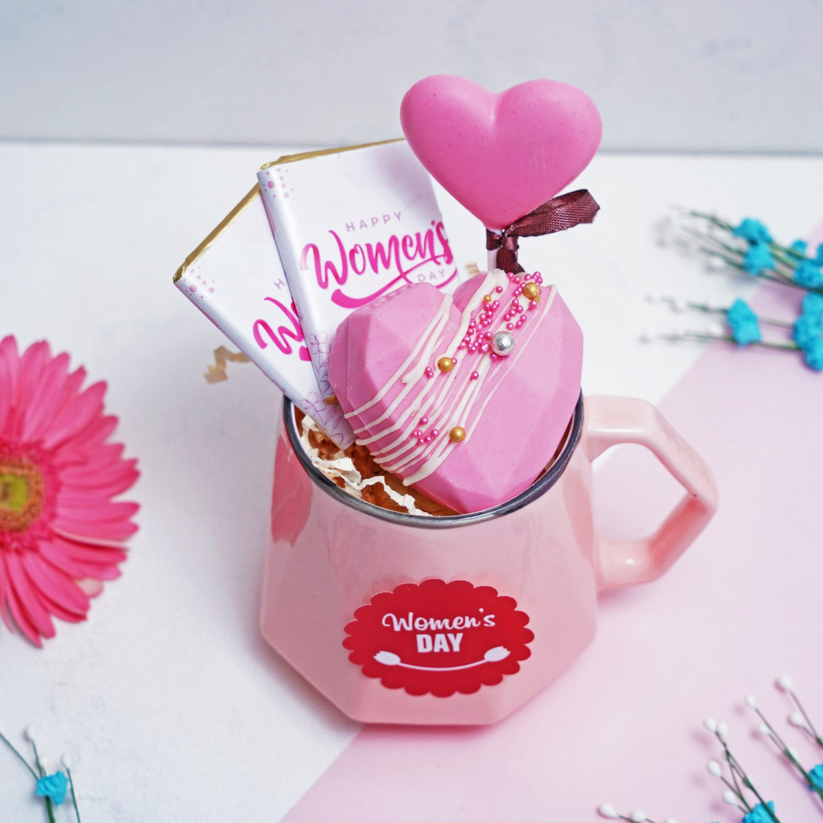 2 chocolate bars, 1 heart shape chocolate pinata, 1 heart shape lollipop