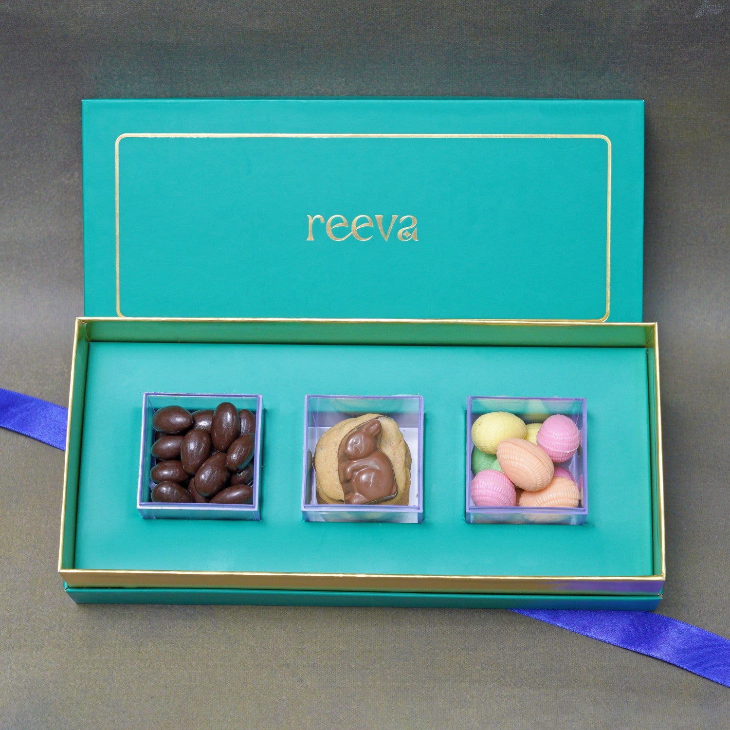 Almond dragees (60 gms), mini eggs (10 pcs), cookies(4 pcs-10 gms each) & 1 rabbit chocolate.